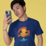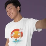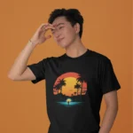 Product Description: Embrace the tranquility of a tropical sunset with our ‘Sunset Silhouette Oasis’ tee. This captivating design features a lone figure standing before a vibrant sunset reflected on the calm ocean waters, surrounded by swaying palm trees. The vibrant color scheme and striking silhouette create a serene yet adventurous atmosphere. Perfect for those who appreciate the beauty of nature and seek a peaceful escape. Crafted from premium, soft-touch cotton for ultimate comfort.