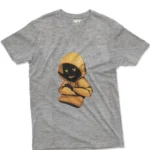 Product Description: A dark-gray, heather-toned t-shirt features a graphic design of a stylized cartoon character.